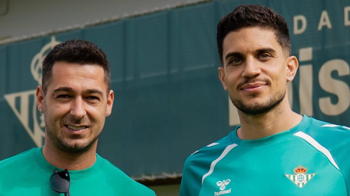 Sergio León y Marc Bartra posando juntos con motivo del Atlético Palma del Río - Real Betis. | Imagen: perfil de X @RealBetis.