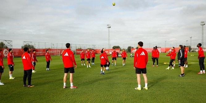 Los jugadores del Sevilla durante la sesión de entrenamiento de este jueves | Imagen: Perfil de 'X' del Sevilla